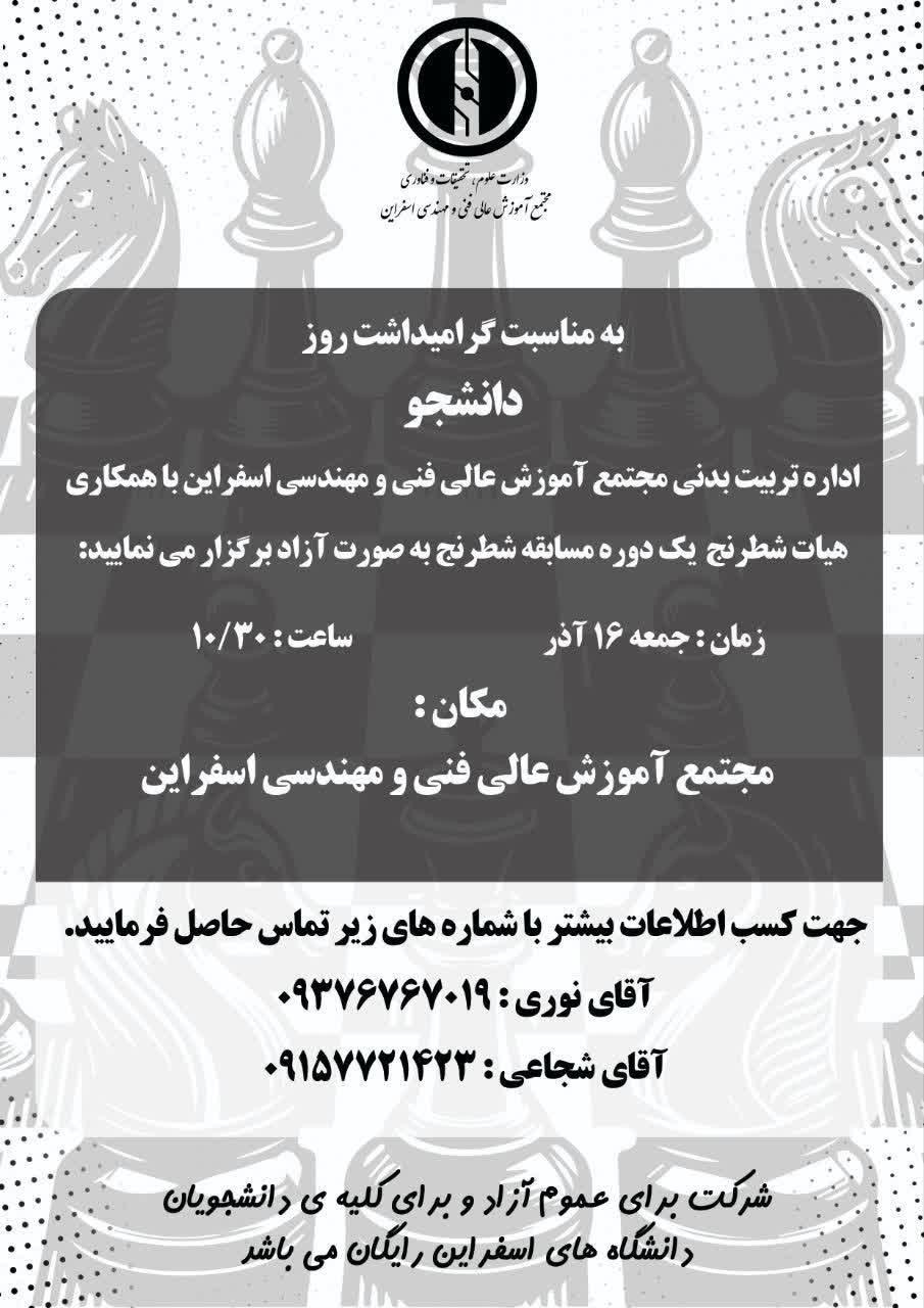 در اولین روز جشنواره ورزشی پاییزه به همت اداره تربیت بدنی مجتمع آموزش عالی فنی و مهندسی اسفراین و هیئت شطرنج شهرستان اسفراین مسابقه شطرنج در روز جمعه 16 آذر ماه در 9 دور به روش سوئیسی برگزار گردید. این مسابقات با حضور 90شرکت کننده شامل دانشجویان و شرکنندگان آزاد از شهرستان برگزار گردید در بخش دانشجویی سید مهدی طاهر آبادی، غلام علی تبار و محمد صمدی به ترتیب به مقام اول تا سوم دست یافتند.