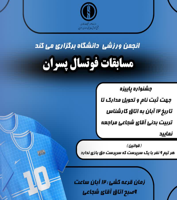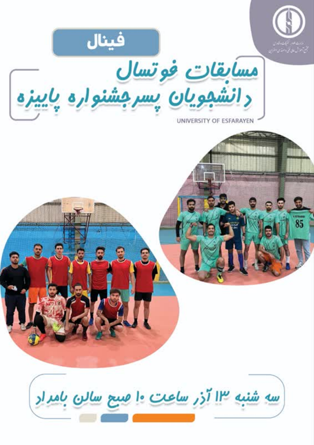 مسابقات فوتسال دانشجویان پسر جشنواره پاییزه از تاریخ 28 مهر ماه لغایت 12 آبان ماه مهلت ثبت نام داده شد و در تاریخ 12 آبان ماه جلسه قرعه کشی بین 9 تیم شرکت کننده برگزار گردید که 9 تیم حاضر به دو گروه 5 و 4 تیمی تقسم گردیده دور اول بازی ها به صورت گروهی دوره ای از روز 17 و 18 آبان پنج شنبه وجمعه به مدت 4 هفته برگزار گردید بعد از مشخص شدن تیم های راه یافته به مرحله نیم نهایی مرحله نیم نهایی به صورت ضربدری برگزار و تیم های راه یافته به مرحله فینال و ردبندی مشخص گردیدند مسابقات فینال ورده بندی در روز سه شنبه 13 آذر برگزار و تیم های شیخ ، مارگون و آزادی به ترتیب به مقام های اول تا سوم دست یافتند گفتی است دراین مسابقات با توجه به اینکه اعضای تیم های 10 نفره بودند 90 دانشجو طی مدت 45 روز مشارکت داشتند و برای داوری مسابقات نیز از داوران خوب هیات فوتبال شهرستان اسفراین استفاده گردید.